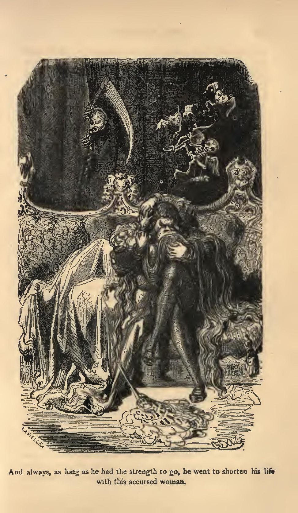 The night came; the little Touranian, exalted with pride caparisoned with desire, and spurred by his “alacks” and “alases” which nearly choked him, glided like an eel into the domicile of the veritable Queen of the Council—for before her bowed humbly all the authority, science, and wisdom of Christianity. The major domo did not know him, and was going to bundle him out again, when one of the chamber-women called him from the top of the stairs—“Eh, M. Imbert, it is Madame’s young fellow,” and poor Philippe, blushing like a wedding night, ran up the stairs, shaking with happiness and delight. The servant took him by the hand and led into the chamber where sat Madame, lightly attired like a brave woman who awaits her conqueror.