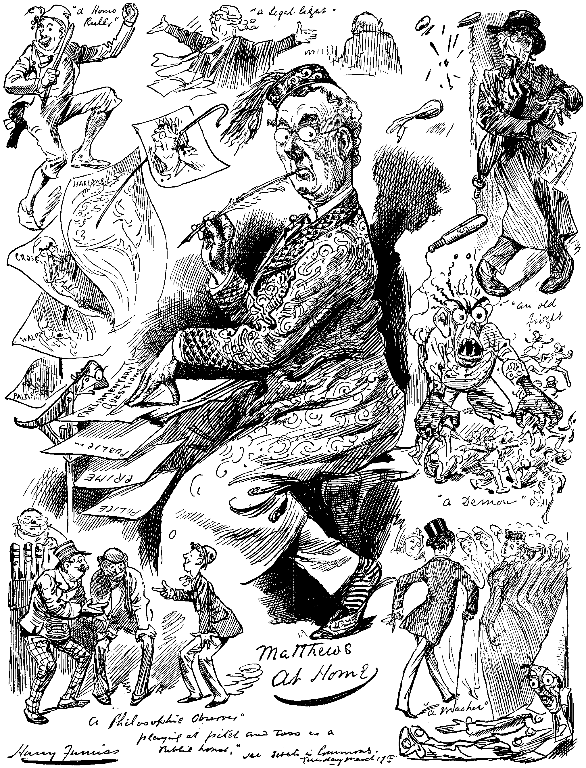 Seemed at one time as if blood would flow, and gore would stain the floor of House. BARNES and WIGGINS were in it, but what it was all about not quite clear. Something to do with a coal-truck. As far as could be made out from choked utterances of BARNES, there had at some remote period been a coal-truck despatched to London by the Midland route. Something happened to it; either it was delayed, or it arrived empty, or it didn't arrive at all. However, it was quite clear to BARNES that the time had come when a new line of railway giving direct access to London from the Midlands was an urgent necessity. WIGGINS observed to be wriggling in his seat during the BARNES oration. Made several attempts to catch SPEAKER's eye; at length succeeded; his suppressed fury was terrible to behold: his rage Titanic. He at least knew all about that coal-truck; though, as far as House was concerned, he did not succeed in lifting the mystery in which BARNES had enveloped it. Whether it was WIGGINS's coal, or merely WIGGINS's truck; whether WIGGINS happened to be in the truck when it went astray; or whether it was BARNES that was in it; or whether nothing was in it but the coal; or whether, coming back to an earlier point, there was [pg 156] no coal in the truck when it did (or did not) arrive at St. Pancras: these were questions the House vainly pursued, withered, as it was, under the wrath of WIGGINS The only point clearly perceived was, that BIGGINS is a director of Midland Railway.