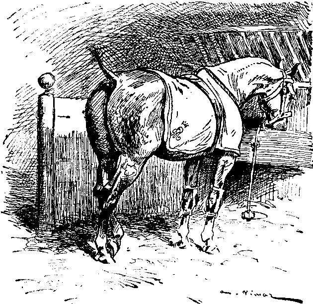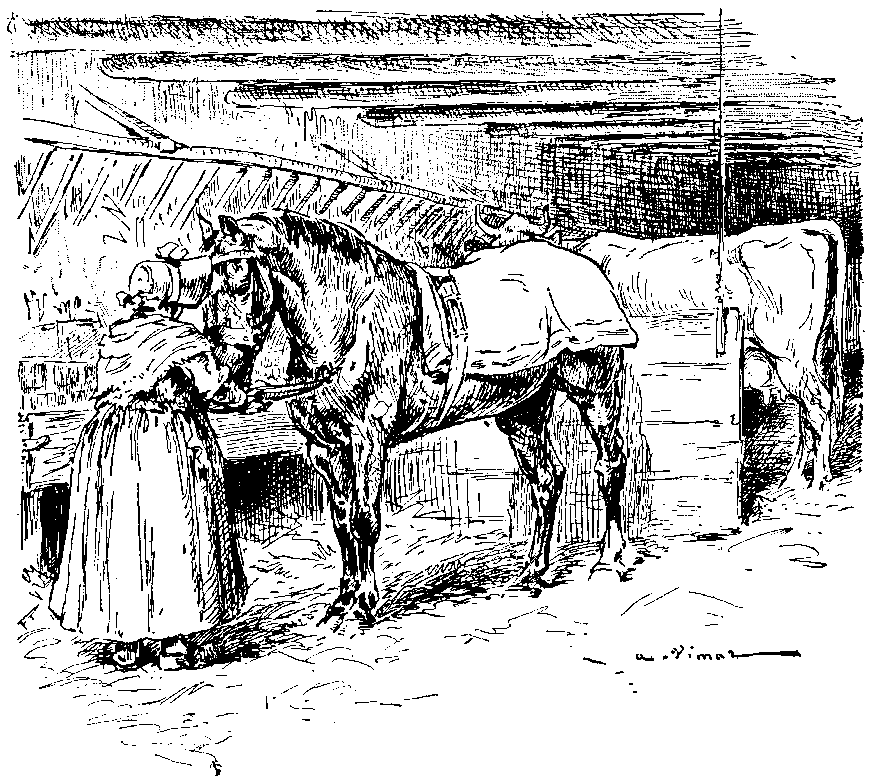 Let me tell you now, dear children, who were the chief occupants of the farm. First there was big "Coco"—a fine Normandy horse—bay-coloured and very fat, whose silky coat had a purple sheen; he had a star on his forehead and a pink mark between his eyes. He was very gentle and answered to the voice of his mistress. If Mother Etienne passed by his stable he never failed to scent her and whinnied at once. That was his way of showing his friendliness and saying
