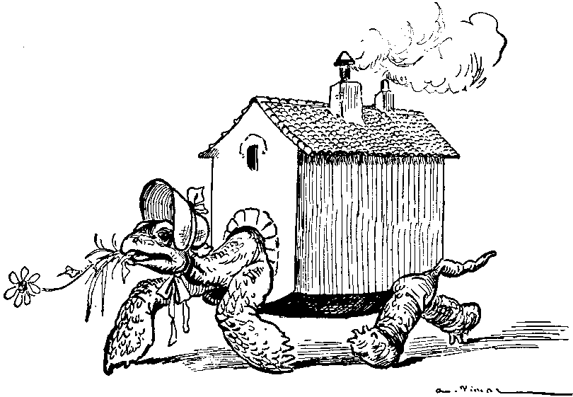 Well cared for and well fed, they grew so rapidly that soon they had to have more space. Mother Etienne housed them then on the edge of the pond in a latticed coop opening onto a sloping board which led down to the water. It was, as it were, a big swimming bath, which grew gradually deeper and deeper. The ducks and geese loved to plunge in and hardly left the water except to take their meals.