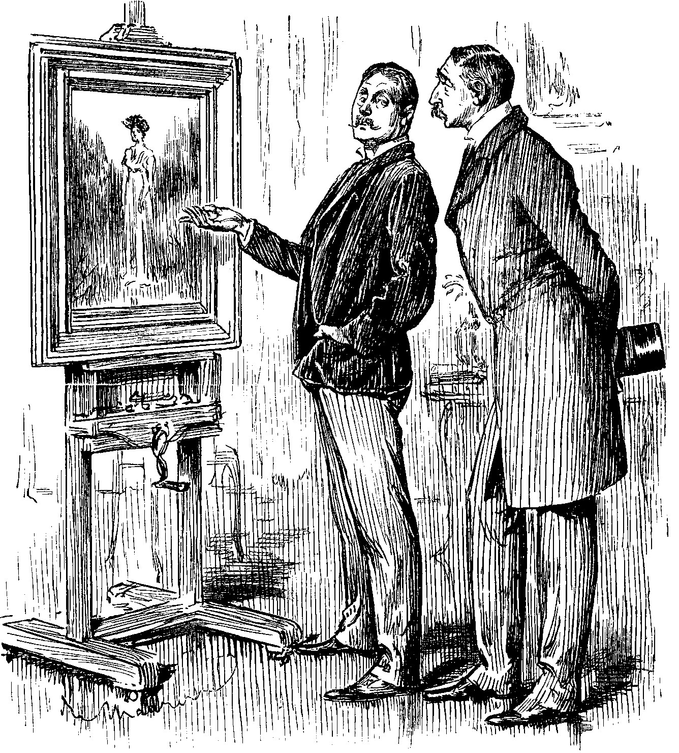No. 459. Stiff Collar Day; or, Just Back from the Wash, "And, confound it! she's been washing my shirt and tie together, and spoilt 'em both. Wish I had another lot ready, but haven't, so must go to Academy as I am," said WALTER S-WASH-BUCKLER LETHBRIDGE, and finished up with an impetuous and irrepressible "Hang it!" "I will," replied the Artist, JOHN PETTIE, R.A.