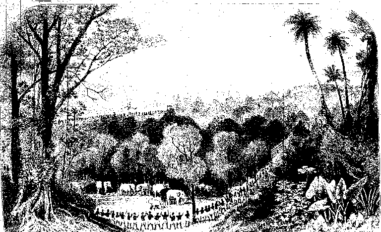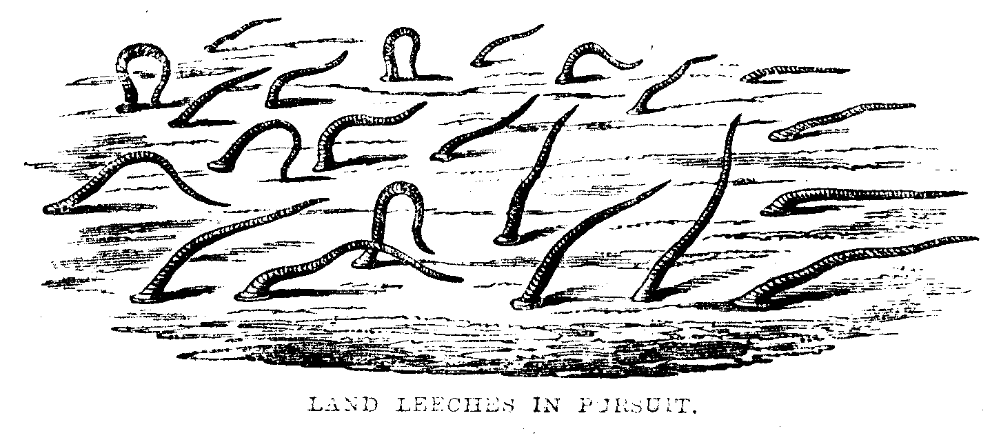 "On the occasion of one of my visits to Adam's Peak, in the prosecution of my military reconnoissances of the mountain zone, I fixed on a pretty little patena (i.e., meadow) in the midst of an extensive and dense forest in the southern segment of the Peak Range, as a favourable spot for operations. It would have been difficult, after descending from the cone of the peak, to have found one's way to this point, in the midst of so [pg 30] vast a wilderness of trees, had not long experience assured me that good game tracks would be found leading to it, and by one of them I reached it. It was in the afternoon, just after one of those tropical sunshowers that decorate every branch and blade with pendant brilliants, and the little patena was covered with game, either driven to the open space by the drippings from the leaves or tempted by the freshness of the pasture: there were several pairs of elk, the bearded antlered male contrasting finely with his mate; and other varieties of game in a profusion not to be found in any place frequented by man. It was some time before I would allow them to be disturbed by the rude fall of the axe, in our necessity to establish our bivouac for the night, and they were so unaccustomed to danger that it was long before they took alarm at our noises.