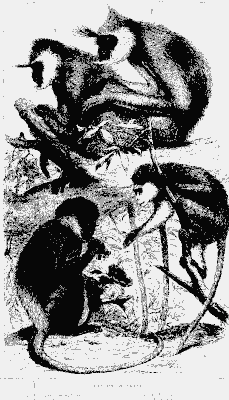 I. QUADRUMANA. 1. Monkeys.—To a stranger in the tropics, among the most attractive creatures in the forests are the troops of monkeys that career in ceaseless chase among the loftiest trees. In Ceylon there are five species, four of which belong to one group, the Wanderoos, and the other is the little graceful grimacing rilawa51, which is the universal pet and favourite of both natives and Europeans. The Tamil conjurors teach it to dance, and in their wanderings carry it from village to village, clad in a grotesque dress, to exhibit its lively performances. It does not object to smoke tobacco. The Wanderoo is too grave and melancholy to be trained to these drolleries.
