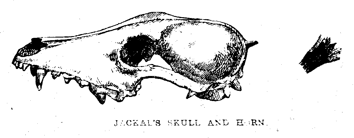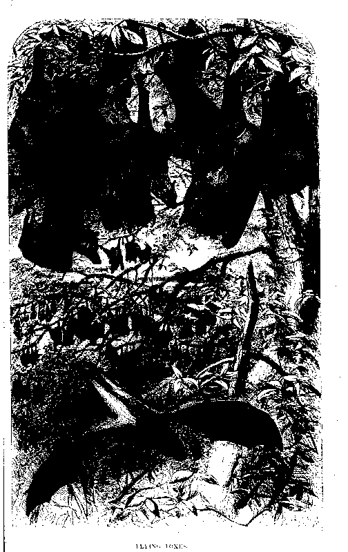 [pg 16]These active and energetic creatures, though chiefly frugivorous, are to some extent insectivorous also, as attested by their teeth161, as well as by their habits. They feed, amongst other things, on the guava, the plantain, the rose-apple, and the fruit of the various fig-trees. Flying foxes are abundant in all the maritime districts, especially at the season when the pulum-imbul162, one of the silk-cotton trees, is putting forth its flower-buds, of which they are singularly fond. By day they suspend themselves from the highest branches, hanging by the claws of the hind legs, with the head turned upwards, and pressing the chin against the breast. At sunset taking wing, they hover, with a murmuring sound occasioned by the beating of their broad membranous wings, around the fruit trees, on which they feed till morning, when they resume their pensile attitude as before.
