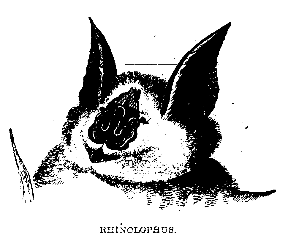 There are several varieties (one of them peculiar to the island) of the horse-shoe-headed Rhinolophus, with the strange leaf-like appendage erected on the extremity of the nose.