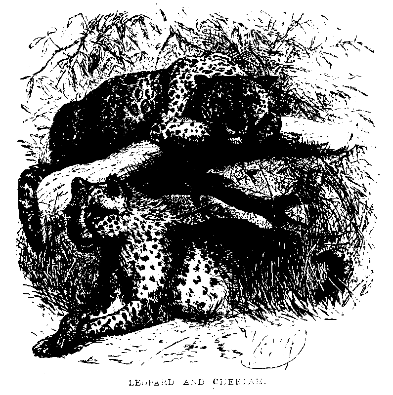 Like the other carnivora, leopards are timid and cowardly in the presence of man, never intruding on him voluntarily, and making a hasty retreat when approached. Instances have, however, occurred of individuals having been slain by them; and it is believed, that, having once tasted human blood, they, like the tiger, acquire an habitual relish for it. A peon, on duty by night at the court-house of Anarajapoora, was some years ago carried off by a leopard from a table in the verandah on which he had laid down his head to sleep. At Batticaloa a "cheetah" in two instances in succession was known to carry off men placed on a stage erected in a tree to drive away elephants from rice-land: but such cases are rare, and, as compared with their dread of the bear, the natives of Ceylon entertain but slight apprehensions of the "cheetah." It is, however, the dread of sportsmen, whose dogs when beating in the jungle are especially exposed to its attacks: and I am aware of an instance in which a party having tied their dogs to the tent-pole for security, and fallen asleep round them, a leopard sprang into the tent and carried [pg 28] off a dog from the midst of its slumbering masters. On one occasion being in the mountains near Kandy, a messenger despatched to me through the jungle excused his delay by stating that a "cheetah" had seated itself in the only practicable path, and remained quietly licking its fore paws and rubbing them over its face, till he was forced to drive it, with stones, into the forest.