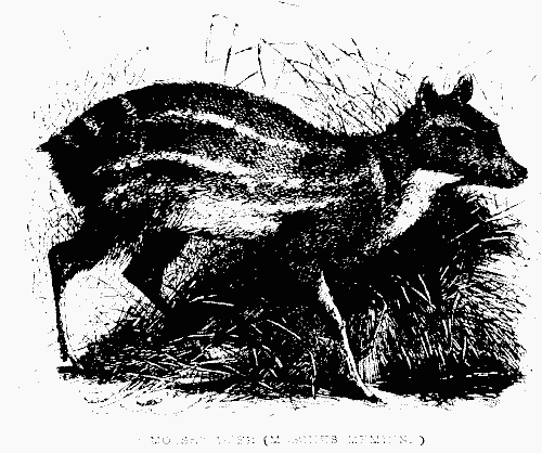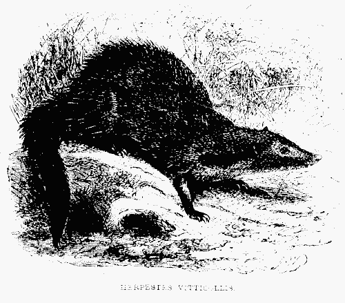 III. CARNIVORA.—Bears.—Of the carnivora, the one most dreaded by the natives of Ceylon, and the only one of the larger animals that makes the depths of the forest its habitual retreat, is the bear221, attracted chiefly by the honey which is found in the hollow trees and clefts of the rocks. Occasionally spots of fresh earth are observed which have been turned up by the bears in search of some favourite root. They feed also on the termites and ants. A friend of mine traversing the forest, near Jaffna, at early dawn, had his attention attracted by the growling of a bear, that was seated upon a lofty branch, thrusting portions of a red-ants' nest into his mouth with one paw, whilst with the other he endeavoured to clear his eyebrows and lips of the angry inmates, which bit and tortured him in their rage. The Ceylon bear is found in the low and dry districts of the northern and south-eastern coast, and is seldom met with on the mountains or the moist and damp plains of the west. It is furnished with a bushy tuft of hair on the back, between the shoulders, by which the young are accustomed to cling till sufficiently strong to provide for their own safety. During a severe drought that prevailed in the northern province in 1850, the district of Caretchy was so infested by bears that the Oriental custom of the women resorting to the wells was altogether suspended, as it was a common occurrence to find one of these animals in the water, unable to climb up the yielding and slippery soil, down which its thirst had impelled it to slide during the night.