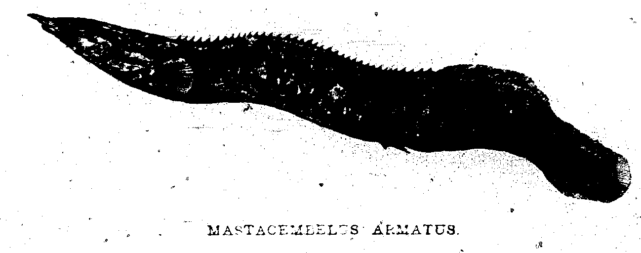 Its strangest peculiarity, and that which gave rise to the belief that it was headless, is its faculty when at rest of throwing back its head and pressing it close between its shoulders till the under side becomes uppermost, not a vestige of head being discernible where we would naturally look for it, and the whole seeming but a casual inequality on its back.