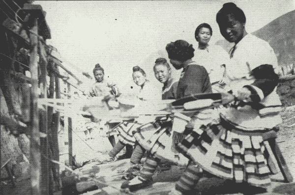 I am of the opinion that the Li-su may be closely allied to the Lolo or the Nou Su, of whom I have spoken in the chapters in Book I dealing with the tribes around Chao-t'ong. And even the Miao bear a distinct racial resemblance. They are of bony physique, high cheek bones, and their skin is nearly of the same almost sepia color. The Li-su form practically the whole of the population of the Upper Salwen Valley from about lat. 25° 30' to 27° 30', and they have spread in considerable numbers along the mountains between the Shweli and the Irawadi, and are found also in the Shan States. Those on the Upper Salwen in the extreme north are utter savages, but where they have become more or less civilized have shown themselves to be an enterprising race in the way of emigration. Of the savages, the villages are almost always at war with one another, and many have never been farther from their huts than a day's march will take them, the chief object of their lives being apparently to keep their neighbors at a distance. They are exceedingly lazy. They spend their lives doing as little in the way of work as they must, eating, drinking, squatting about round the hearth telling stories of their valor with the cross-bow, and their excitement is provided by an occasional expedition to get wood for their cross-bows and poison for their arrows, or a stock of salt and wild honey.