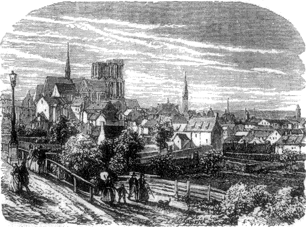 In leaving Cologne for Aix-la-Chapelle you turn your back to the river—a particular which suited my mood well enough. The railway bore us away from the Rhine-shore at an abrupt angle, and in my notion the noble Germanic goddess or image seemed at this point to recede with grand theatric strides, like a divinity of the stage backing away from her admirers over the billowy whirlpool of her own skirts. As I dreamed we penetrated the tunnel of Königsdorf, which is fifteen hundred yards long, and which seemed to me sufficiently protracted to contain the slumber of Barbarossa. The thought gave me a useful hint, and I fell into a light sleep, while Charles and Hohenfels pervaded the darkness merely by their perfumes—the former with whiffs at a concealed bottle of Farina, the latter with a pastille counterfeiting the incense of the cathedral. In a couple of hours from the Hôtel de Hollande we reached Aachen, as the fond natives call the burgh so dear to Charlemagne. Deprived of that [pg 10] magnificent mirror, the Rhine, the pretty towns throughout this part of Germany seem but like country belles. We should hardly have paused at Aix but for the sake of affording a rest to Charles, who grew worse whenever lunch-time competed with railway-time. As for the dull little city, for us it was a wilderness, with the blank cleanliness of the desert, except in so far as it was informed and populated by the memory of Charlemagne.