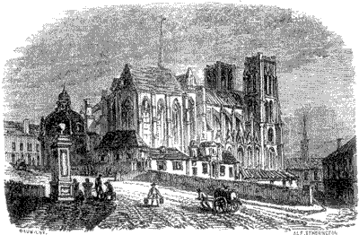 Here he died, and entered his tomb in the church himself had founded. Into this sepulchre the emperor Otho III. dared to penetrate in the year 997, impelled by a motive of vile and varlet-like curiosity. They say the dead monarch confronted his living visitor in the great marble chair in which he had been seated at his own command, haughty and inflexible as in life, the ivory sceptre in his ivory fingers, his white skull crowned with the diadem of gold. The peeping emperor looked upon him with awe, half afraid of the mysterious and penetrating shadows that reached forth out of his rayless eyes. Before he left, however, he peered about, touched the sceptre and the throne, fingered this and that, and having, as it were, trimmed the nails and combed the beard of the great spectre, retired with a valet's bow. Observing that Charlemagne had lost most of his nose, he caused it to be replaced in gold very delicately chiseled and enchased. The sacrilege was repeated by Frederick Barbarossa in 1165, who went farther and forced Charlemagne to get up from his chair before him. The corpse, in rising, fell in pieces, which have been dispersed through Europe as relics. We saw such of them as remain here at the Chapelle. I was allowed, for about the equivalent of an American dollar, to measure the Occidental emperor's leg—they call it his arm. And then, as a makeweight in the bargain, the venal sacristan placed in my hands the head of Charlemagne.