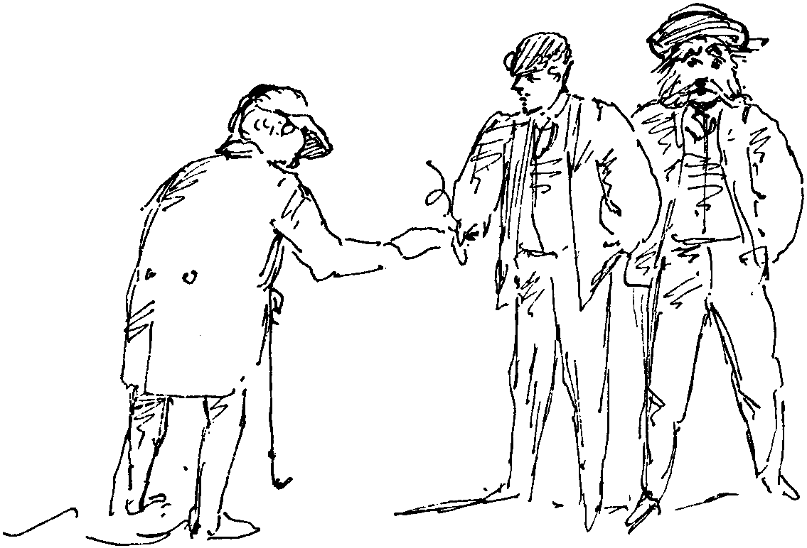 It is hard to fancy anything less like Bohemia than Regent Street, but a little incident that {127} occurred as I walked down that busy thoroughfare one afternoon recalls the best traditions of the land in which practical jokes abound. I was going along without any definite aim, killing time and gathering wool, flanéing, in fact; perhaps there was a touch of the foreigner about me, for I had only lately returned from abroad; anyway I suddenly found myself singled out as a fit subject to be victimised. I felt a hand stealthily sliding into my pocket; on the spur of the moment I grasped that hand in as much of an iron grip as I could muster. Then—I hardly know why—I waited quite a number of seconds before I turned round. When I did, it was du Maurier's face that I beheld, blanched with terror. Those seconds had been ages to him. Good heavens! had he made a mistake? Was it not Bobtail's but another man's hand that was clutching his wrist? Thank Heaven, it was Bobtail's!
