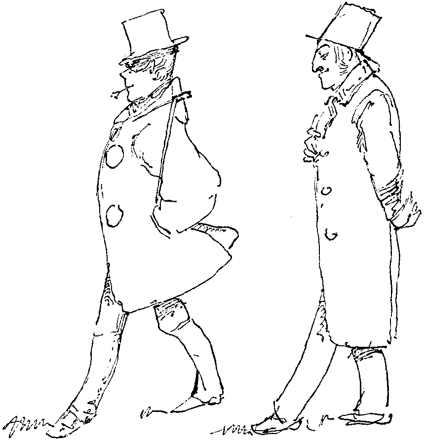 {30} {31}In those days we called all that caricaturing, and caricature he certainly did; mainly me and himself. From the first he imagined he saw a marked contrast between us. His nose was supposed to be turned up, and mine down, whereas really neither his nor mine much deviated from the ordinary run of noses; my lower lip certainly does project, but his does not particularly recede, and so on. But the imaginary contrast inspired him in the earliest days of our acquaintance, and started him on the warpath of pen-and-inking. He drew us in all conceivable and in some inconceivable situations. "Moscheles and I," he says on one page, "had we not been artists, or had we been artistically beautiful; then again, if we were of the fair sex, or soldiers, or, by way of showing our versatility, if we were horses." In that page he seems to have focussed the essence of our characteristics, whilst appearing only to delineate our human and equine possibilities. Poor F., {32} one of our German friends, fares badly, a donkey's head portraying him "s'il était cheval."