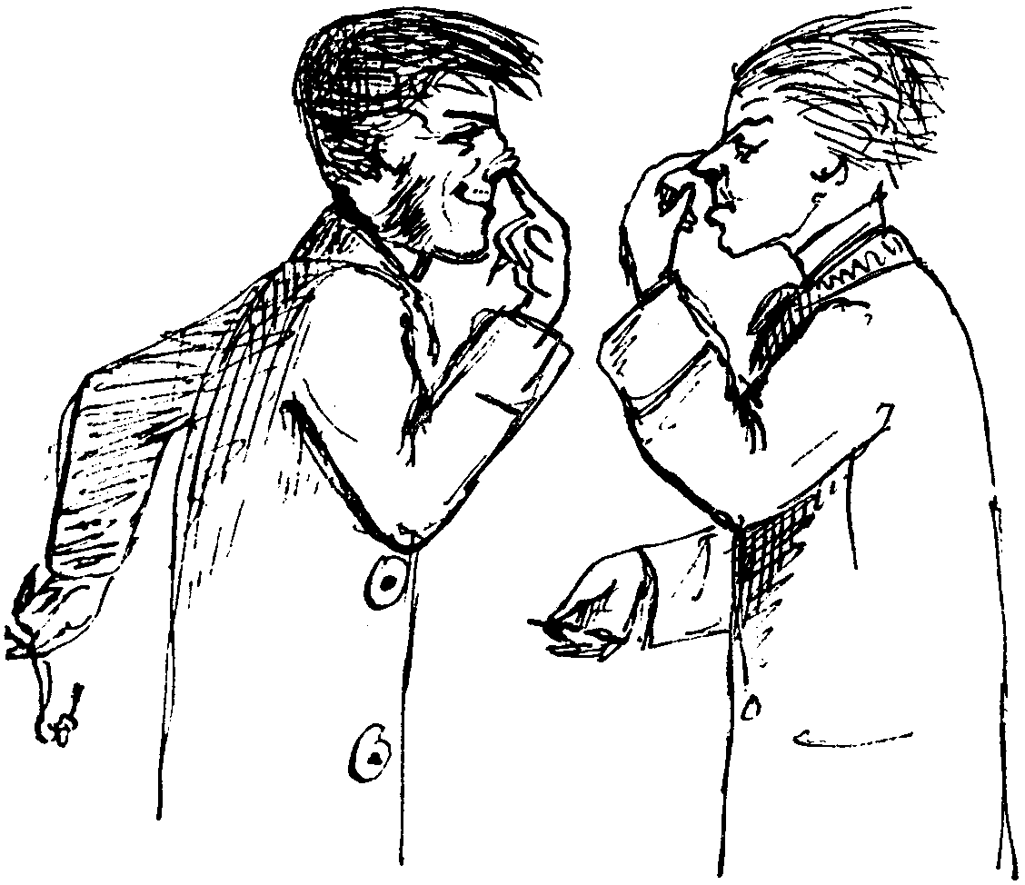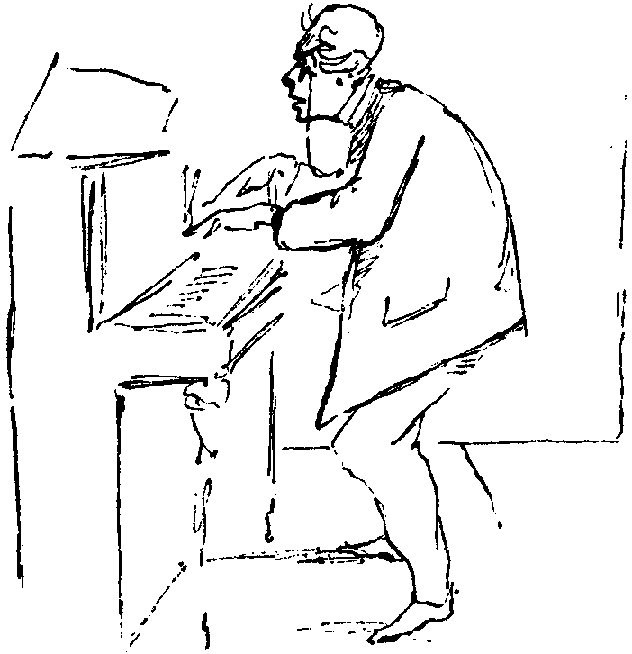 {21}It has always been a source of legitimate pride to me to think that I should have been the tool selected by Providence to sharpen du Maurier's pencil; there must have been something in my "Verfluchte Physiognomie," as a very handsome young German, whom I used to chaff unmercifully, called it, to reveal to du Maurier hidden possibilities and to awaken in him those dormant capacities which had betrayed themselves in the eager glance above named.