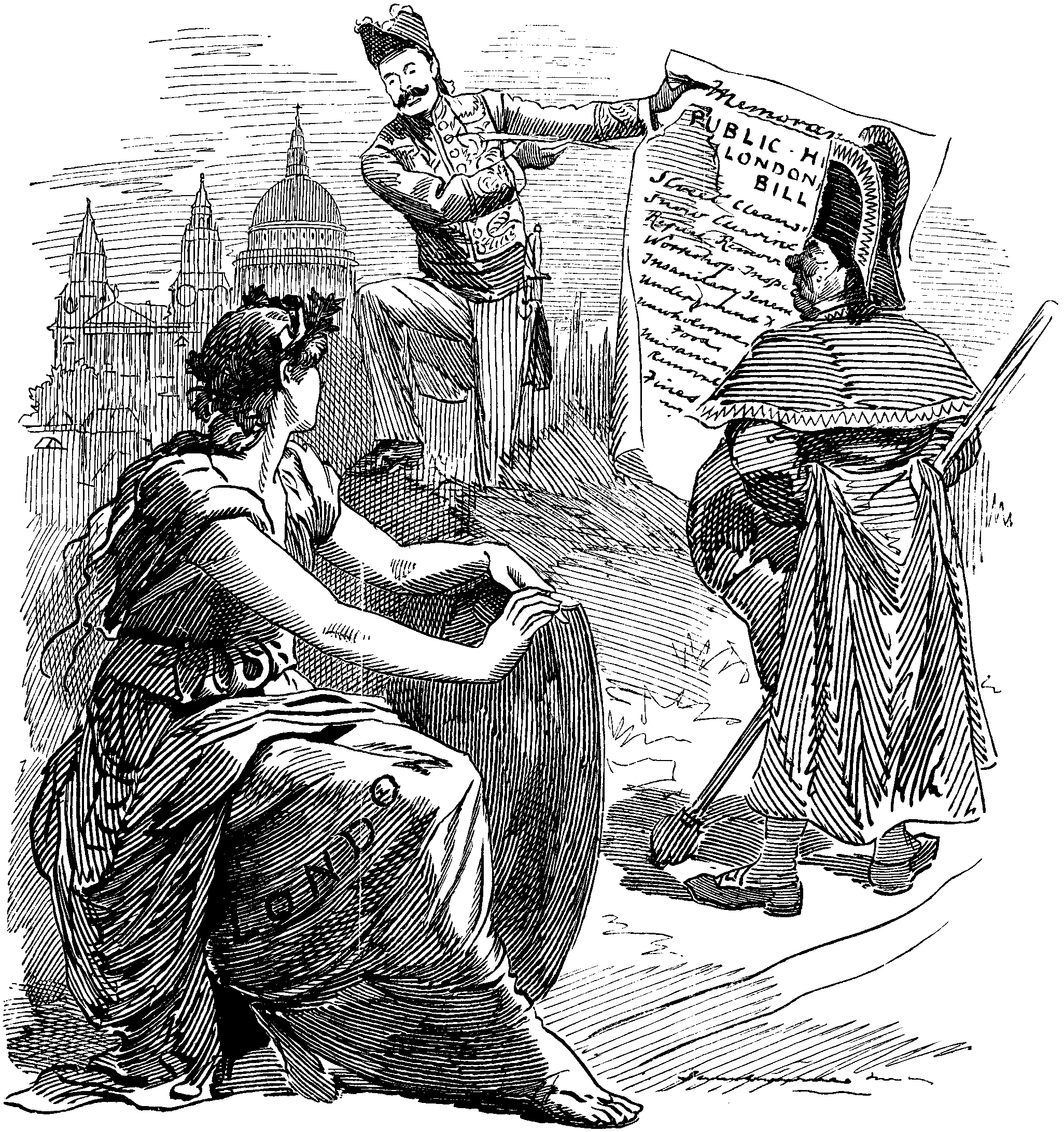 ["Mr. Ritchie ... has taken the unusual step of preparing a memorandum explanatory of ... the Public Health (London) Act, which comes into operation on the 1st of January ... The Vestries and District Councils ... have come out with increased powers, but also with increased responsibilities. They are in future known as 'the sanitary authorities'; they must make bye-laws, and enforce not only their own, but those made by the County Council; and, if they fail in their duty—as, for example, in the matter of removing house-refuse, or keeping the streets clean—they are liable to a fine. It is pleasant to think that, in future, any ratepayer may bring Mr. Bumble to book."—The Times.]