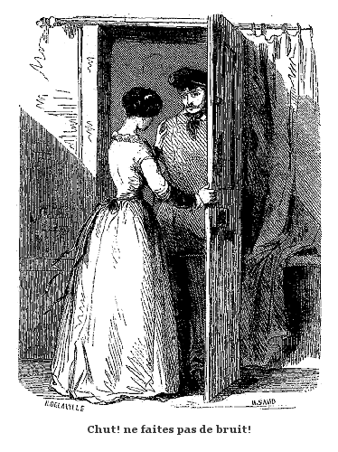 L'enfant, effrayé de la grosse barbe noire d'Horace, s'était rejeté, en criant, dans le sein d'Eugénie.