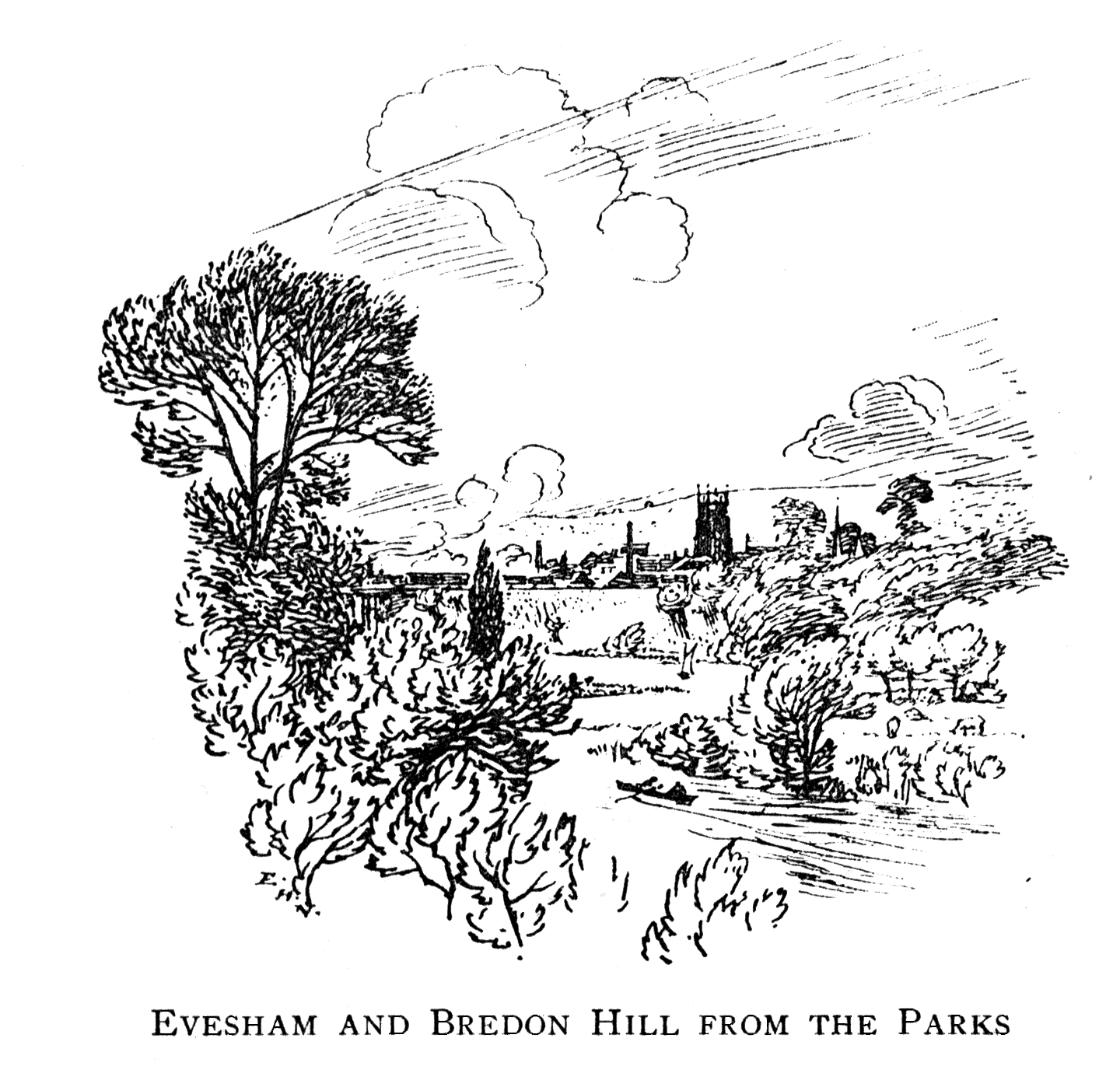 Evesham stands on a kind of peninsula formed by a deep loop of the river Avon on its way from Stratford-on-Avon to Tewkesbury. The broad vale in which it lies is enclosed by a semicircle of hills, which provide a background to every varied landscape, and give a sense of homeliness and seclusion which those who are familiar with unbroken stretches of level country will at once recognise and appreciate. From the east to the south-west range the Cotswolds, not striking in outline but depending for their beauty in great part upon the play of light and shade and the variety given by atmospheric effects. To dwellers in the vale the appearance of the hills not only reflects the feeling of the day but foretells the coming weather. When a delicate, blue haze shrouds their forms, entirely obliterating the more distant heights, the pleasure-seeker rests content in the promise of a fair morn; but no pleasant expectations can be formed when, robed in deepest purple, they seem to draw in and crowd together, and with vastly increased bulk to frown upon the darkening vale.