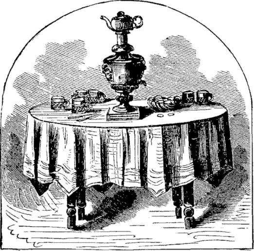 In the waiting room a hundred or more persons were gathered. The men were well wrapped in furs, and among the ladies hoods were more numerous than bonnets. Three-fourths of the males and a third of the females were smoking cigarettes, and there was no prohibition visible. In accordance with the national taste the chief article sold at the buffet was hot tea in tumblers.