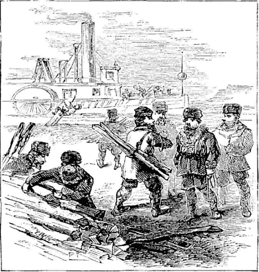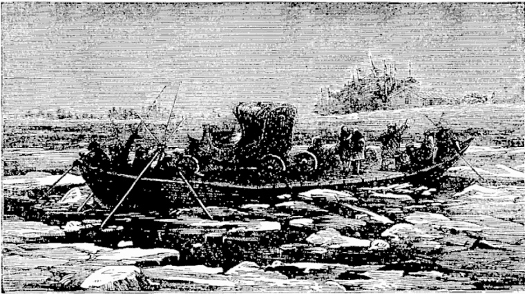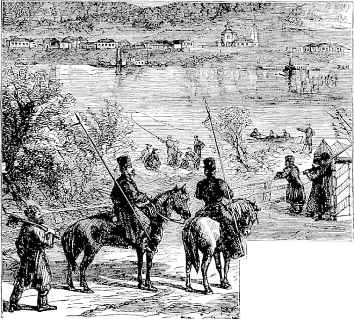 About three o’clock in the afternoon of the second day from Kazan, the yemshick pointed out the spires of Nijne Novgorod, on the southern bank of the Volga. A fleet of steamers, barges, and soudnas lay sealed in the ice along the shore, waiting for the moving of the waters. The road to the north bank was marked with pine boughs, that fringed the moving line of sleighs and sledges. We threaded our way among the stationary vessels, and at length came before the town. A friend had commended me to the Hotel de la Poste, and I ordered the yemshick to drive there. With an eye to his pocket the fellow carried me to an establishment of the same name on the other side of the Oka. I had a suspicion that I was being swindled, but as they blandly informed me that no other hotel with that title existed, I alighted and ordered my baggage up.
