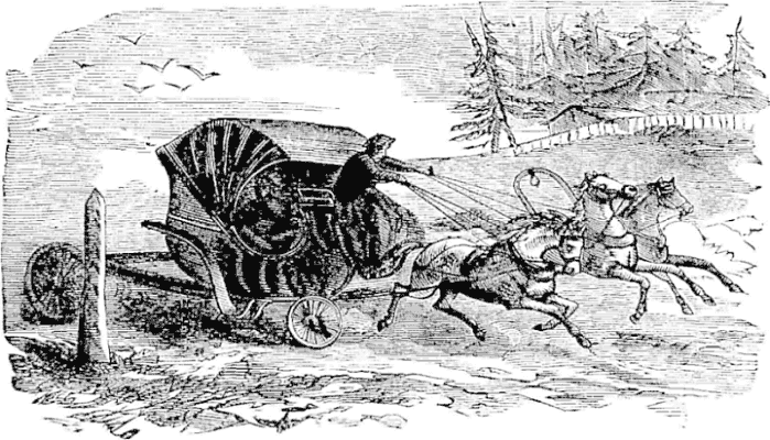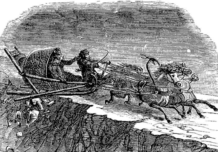 It was a long drive from the station to the hotel. The morning was clear and cold, and the snow in the streets had been ground into a sand-like mass several inches deep. The solid foundation beneath was worn with hollows and ridges, that vividly recalled the oukhabas of the post road. Streets were full of sleds and sleighs, the latter dashing at a rapid rate. In the region near the station there were so many signs of ‘Trakteer’ as to suggest the possibility of one half the inhabitants selling tea, beer, and quass to the other half. Near the center of the city the best shops displayed signs in French or English, generally the former.