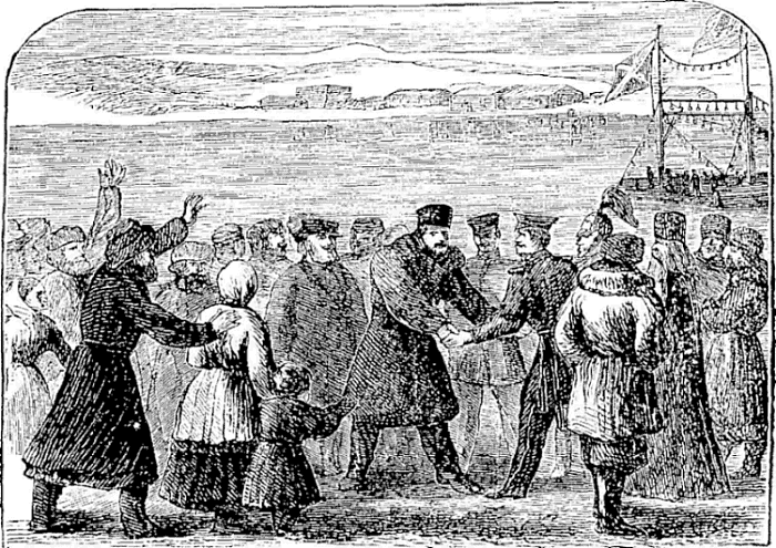 The train halted at the station nearest St. Petersburg, and as we stood a moment upon the platform, we saw the great, gilded dome of St. Isaac’s cathedral rising over the city. In St. Petersburg my first duty was to take breakfast, a bath, and a change of clothes at a hotel, and then, to drive to the banker’s for letters from home. I had not seen an American for five months; as I alighted from my droshky, a well-dressed individual looked at me, and not to be outdone I returned his glance. Our eyes peered over two fur collars that exposed very little of our faces. After a moment’s hesitation each of us spoke the other’s name, and I experienced the double pleasure of meeting in one individual a countryman and an old friend.