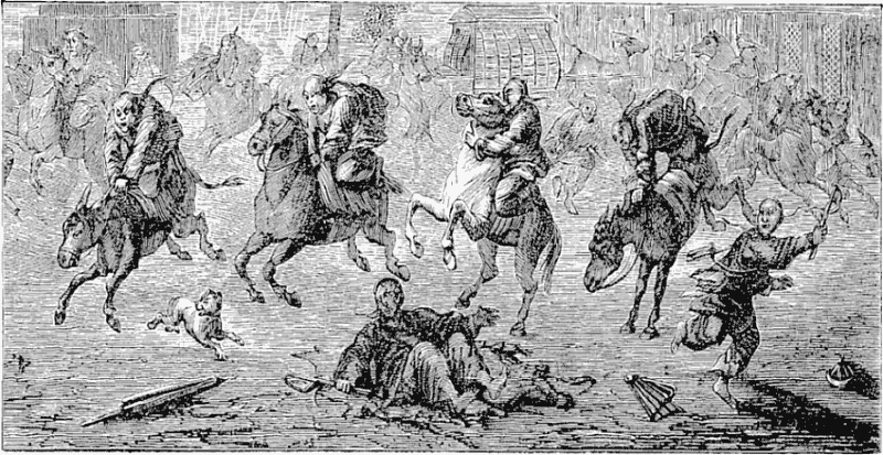 The Kitai Gorod, or Chinese town of Moscow, is close by the Kremlin and outside its walls. The only feature worthy the name of this part of the city is the number of Tartar inhabitants and the immense bazaar, or Gustinni Dvor, where the principal trade of Moscow has been centered for nearly three hundred years. The quantity of goods in the bazaar is something enormous. A Russian said to me: “If half the houses in Moscow were stripped of furniture, ornaments, and all things save the walls and roofs; if their inhabitants were plundered of all clothing and personal goods except their bank accounts,—the gastinni dvor could supply every deficiency within two hours. You may enter the bazaar wearing nothing but your shirt, and can depart in an hour dressed and decorated in any manner you choose, and riding in your carriage with driver and footman in livery.”