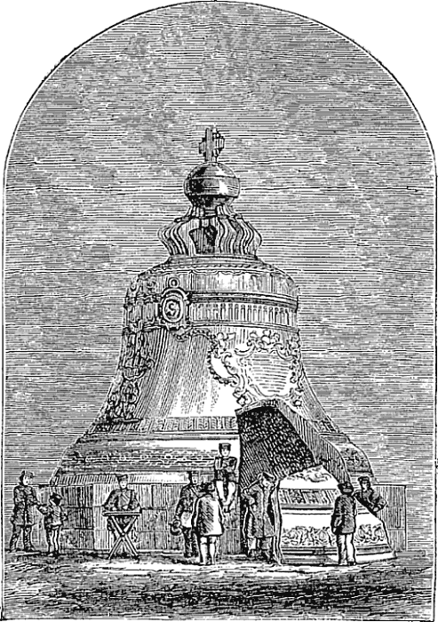 Of course I went early to the Kremlin. Who has ever read or talked of Moscow without its historic fortress? Entering by the Sacred Gate, I lifted my hat in comformity to the custom, from which not even the emperor is exempt. One of my school-books contained a description of the Czar Kolokol, or Great Bell, and stated that a horse and chaise could pass through the hole where a piece was broken from one side. Possibly the miniature vehicle of Tom Thumb could be driven through, but, certainly, no ordinary one-horse shay could have any prospect of success. The hole is six feet in height, by about a yard wide at the bottom, and narrows like a wedge toward the top. The height and diameter of the bell are respectively nineteen feet four inches by twenty feet three inches. It weighs 444,000 pounds. It was cast in 1733, by order of the Empress Anne, and the hole in its side was made by the falling of some rafters during a fire in 1737. It remained buried in the ground until 1836, when it was raised and placed on its present pedestal by order of the Emperor Nicholas.