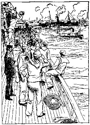 Unconsciously I glanced across the deck to where three men were hauling upon a whip, or block-and-tackle, which was being used to hoist huge boxes and casks of provisions on board. The three men were working sturdily, and it would have been difficult to recognize in them, with their grimy faces and soiled duck uniforms, a doctor, a bank cashier, and a man-about-town well known in New York City. Near the forward hatch, industriously swabbing the deck, was a black-haired youth whose father helps to control some of the largest moves on 'Change. Scattered about the gangway were others, some painting, some rolling barrels, and a number engaged in whipping in heavy boxes of ammunition. They were all cheerful, and the decks resounded with merry chatter and whistling and song.