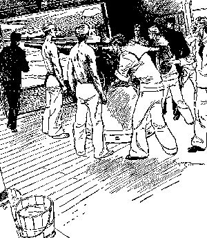 From now on we were given a taste of the actual work of the service. Details were made up each morning and sent to the "Yankee" to assist in getting her in readiness for service. One of the first duties was to carry on board and stow away in the hold one hundred kegs of mess pork. As each keg contained one hundred pounds, the task was not easy for men unaccustomed to manual labor. Still there was no complaint. In fact, the only growling heard so far had come from some of the men who had seen service in the regular navy. Burke, the fireman, declaimed loudly against the "shoe leather an' de terrer-cotter hard-tack which they do be tryin' to feed to honest workers. As for the slops they call coffee, Oi wouldn't give it to an Orangeman's pig!"