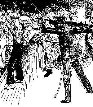 Glancing up, "Hod" saw a man's figure, dimly outlined in the gloom, slip from the topgallant forecastle and quickly descend the rope. It was evidently one of the men taking "French" leave, and it was the sentry's duty to give the alarm at once. But "Hod" had other views in this particular case. Hastily stepping back into the shadows, he laid his gun upon the floor of the dock, and rolled up his sleeves with an air that meant business. The next moment the absconder dropped from the rope.