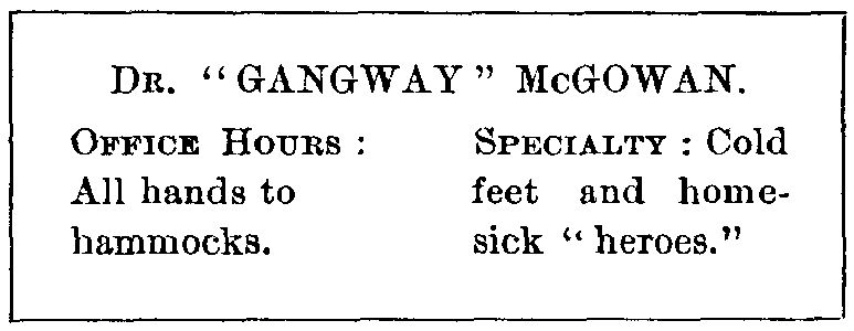 "Uncle Sam is a queer bird," several of us overheard him remark to a mate. "He do be making a picnic av this war wid his pleasure boats an' his crew av pretty b'yes. If we iver tackle the Spaniards, there'll be many a mama's baby on board this hooker cryin' for home, swate home."