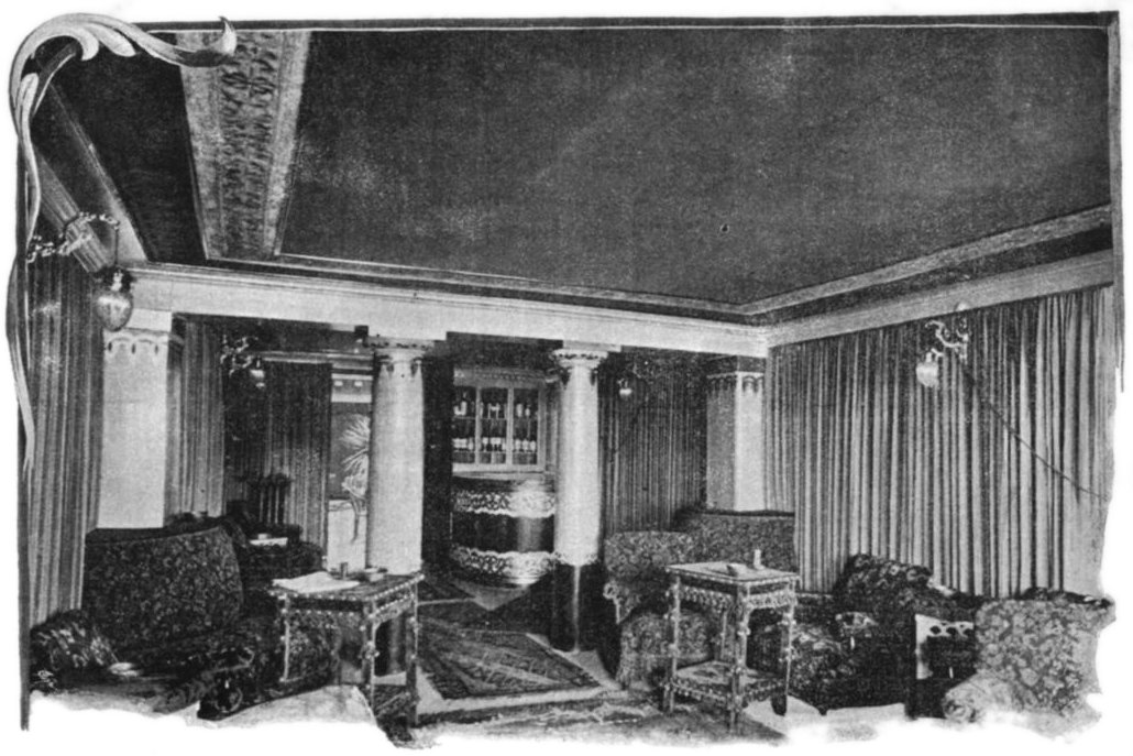Opposite the grand stairs is a luxurious Smoking Room, its walls hung with rich material, and furnished in Oriental comfort and style, with an American Bar leading out of it. Next it, are two spacious Reading and Writing Rooms, containing the principal newspapers and illustrated publications of the world.