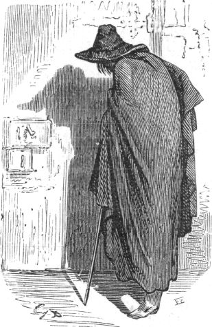 Directly a man in a cloak and slouched hat, and holding in his hands a wire fencing-mask, extinguished with it the red nose. The latter met his fate with stolid fortitude. All were perfectly still, but the twitching cheeks of most of the spectators betrayed a laugh retained with difficulty. The cloak then advanced, like a less beautiful Norma, to a bell in the portico, and struck three tragical strokes. A strong, pealing bass voice came from the interior: "Who dares knock at this door?"