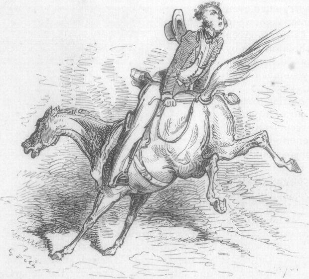 Relieved of his mask, fixed like a dry forked stick, wrong side foremost, on a frightened steed which galloped down the avenue, and pursued by the racket of empty bottles beaten against the wine-frames, came the Scotchman, like an unwilling Tam O'Shanter. At a new outburst of resonant noises, which we could not help offering to the general confusion, the horse stopped, and assumed twice or thrice the attitude of a gymnast who walks on his hands. The figure of the man, still rigid, flew up into the air like a stick that pops out of the water. The Terrible Brothers received him in their arms.