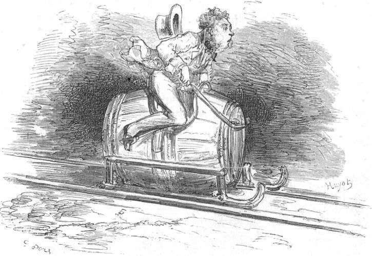 Hardly restored to equilibrium, the patient was quickly replaced in the saddle, but the saddle was this time girded upon a barrel, and the barrel placed upon a truck, and the truck upon an inclined tramway. His impassive countenance might be seen to kindle with indignation and horror, as the hat which had been jammed over his eyes flew off, and he found himself gliding over an iron road at a rate of speed continually increasing.