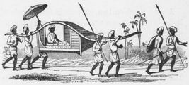 However, although the poor people live in this way, the princes and nobles lead a far different life; an eastern grandee could formerly do anything he chose, even to killing of his wives and slaves, and, only I do not wish to frighten you, I could tell you many stories about the cruelty of the Indian nobles. They live in great state, and are always surrounded by a throng of slaves, and attendants, who wait on them as they recline lazily on a pile of the softest cushions, which are covered with the skins of beasts, and with silks, velvets, and satins. When they go abroad they are carried in what is called a palanquin, borne on the shoulders of servants, if they do not choose to ride on a horse or an elephant.