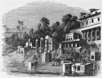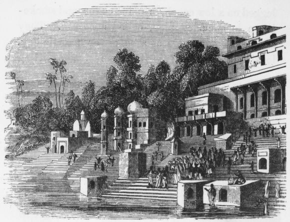 A very cruel custom prevails in many parts of India, which I know will shock you very much: when a Hindoo of rank dies, his widow is laid by his side on a pile of faggots, which being set fire to, the poor creature is suffocated, or else burnt alive, and they pretend that she likes to be so destroyed. The ceremony is called a "Suttee," and is conducted with great pomp, all the relations of the woman and her dead husband being present, in addition to an immense crowd; before getting on the pile, the widow divides all her jewels and ornaments amongst her friends. Here is a picture of a widow about to bathe in a "consecrated" river, before going to be burnt.