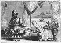 What splendid caps, slippers, veils, and perfumes, with such picturesque guns and swords, from Turkey! The Turks are a fine, handsome race of people, and very grave and sensible, except when they are angry, when they grow raging and furious; they are fond of ease; and the chief delight of those who can afford it is to sit cross-legged on a low couch, drinking coffee, and smokeing a long curled pipe, called a hookah. They often sit by the side of a canal for a whole day, looking at children flying kites. Instead of sitting at a table to dine, they put the dishes on a carpet of Turkey leather, and sit round it on the floor, eating, with wooden spoons, meat and rice stewed together, called pilau. They are not allowed to drink wine, or eat pork. A favourite diversion with them is playing on a kind of lute, and sometimes they amuse themselves with chess, draughts, and other games; but their principal amusement, like some of my little friends, is to sit and listen to stories, told by men who earn their livelihood by relating entertaining tales and romances.