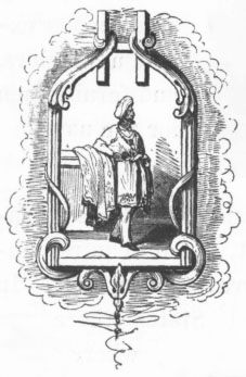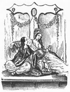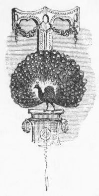 But among the curious articles we must notice this imitation of a camelia japonica tree in china, with buds, leaves, and blossoms, all perfect, which came from Germany;—and that painted oil-cloth from Manchester, covered with the most extraordinary mathematical ornaments, and which took eleven years to complete, and is worth 500 guineas. And that table, made of 38,000 pieces of wood, of twenty-eight different colours, looking like mosaic, which was sent from Switzerland. Nor must we forget to look at this piece of gold, on which is engraved "The Lord's Prayer," and is yet so small that a common pin-head covers it: that came from Portsmouth. And here is a German bed, which being wound up, like a clock, to a certain hour, throws the sleeper out on the ground, when the time comes; no lazy lie-a-beds with that, I fancy!