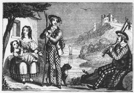 The women are extremely domestic, delighting in their children; and all the Swiss are remarkable for their passionate love of home. In every village there is a school, established by the Government for the instruction of poor children. The Swiss are the most graceful of all peasants, and wear very smart costumes. The men wear large hats, and their dress is generally a brown cloth jacket without sleeves, and puffed breeches of ticking. The women have short blue petticoats, a cherry-coloured boddice, full white sleeves fastened above the elbow, and a muslin kerchief thrown round their necks; while their hair is plaited, and twisted about their heads. They also wear pretty flat straw hats, ornamented with bows of ribbon.