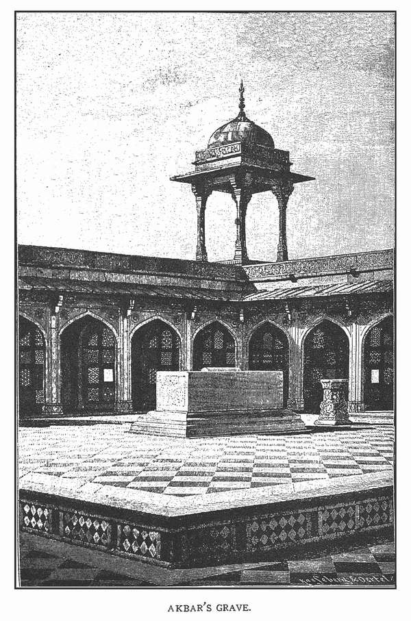 Akbar lost his best friends and his most faithful servants before he finally succumbed to a very painful abdominal illness, which at the last changed him also mentally to a very sad extent, and finally carried him off on the night of the fifteenth of October, 1605. He was buried at Sikandra near Agra in a splendid mausoleum of enormous proportions which he himself had caused to be built and which even to-day stands almost uninjured.