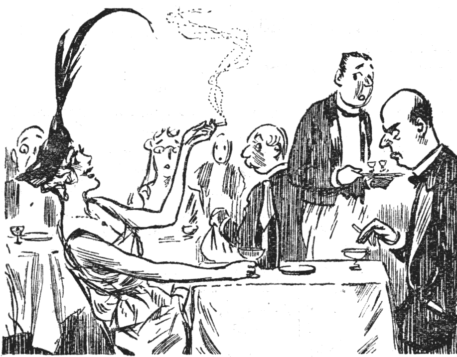 [Dr. ARTHUR SHADWELL, in the January Nineteenth Century, in his article on "Ordeal by Fire," after denouncing idlers and loafers and shirkers, falls foul "above all" of the young girls called flappers, "with high heels, skirts up to their knees and blouses open to the diaphragm, painted, powdered, self-conscious, ogling: 'Allus adallacked and dizened oot and a 'unting arter the men.'"]