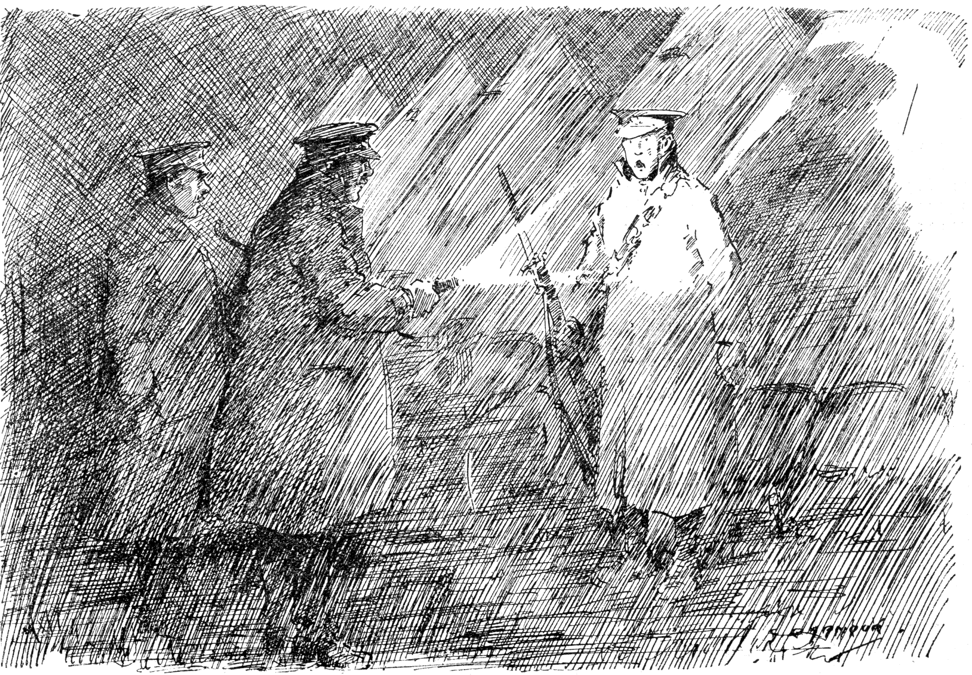 PRIVATE SLOGGER, JUST ARRIVED WITH LAST DRAFT AND ON GUARD DUTY FOR FIRST TIME, FORGETS HIMSELF WHEN THE COLONEL APPEARS ACCOMPANIED BY HIS DAUGHTER.