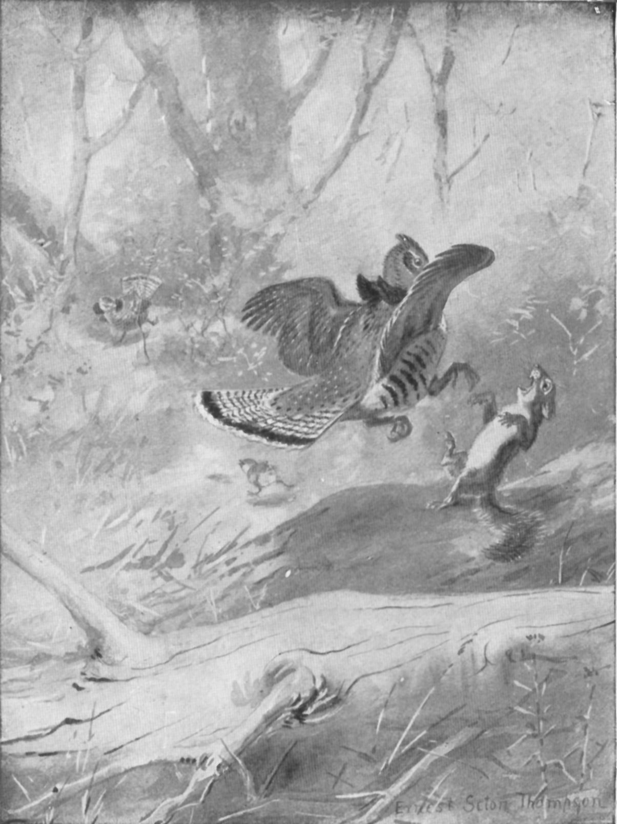 One day late in the Acorn Moon, that is, about mid-October, as the grouse family were basking with full crops near a great pine log on the sunlit edge of the beaver-meadow, they heard the far-away bang of a gun, and Redruff, acting on some impulse from within, leaped on the log, strutted up and down a couple of times, then, yielding to the elation of the bright, clear, bracing air, he whirred his wings in loud defiance. Then, giving fuller vent to this expression of vigor, just as a colt frisks to show how well he feels, he whirred yet more loudly, until, unwittingly, he found himself drumming, and tickled with the discovery of his new power, thumped the air again and again till he filled the near woods with the loud tattoo of the fully grown cock-partridge. His brother and sister heard and looked on with admiration and surprise; so did his mother, but from that time she began to be a little afraid of him.