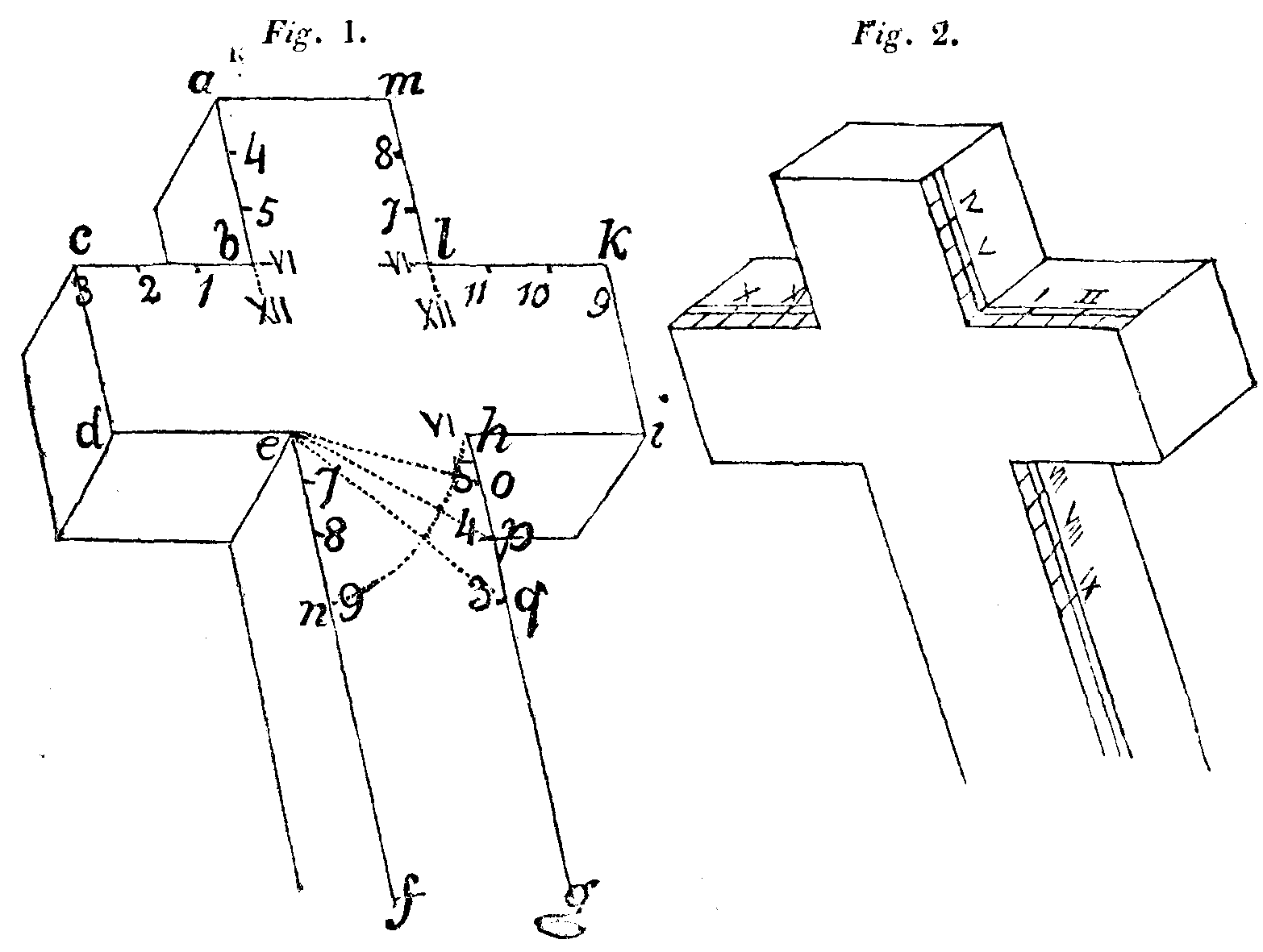 To make a Cross Dial.—A cross dial is one which shows the time of the day without a gnomon, by a shadow of one part of the dial itself, appearing upon another part thereof. Observe.—In making this dial you need have no regard to the latitude of the situation, for that is to be considered in the placing, and not in the making of it. 1st. Prepare a piece of wood or stone of what size you please, and fashion it in the form of a cross (see fig. 1) so that ab, bc, cd, de, eh, hi, ik, kl, lm, and ma, may be all equal: the length of ef is immaterial, it may be more than double to a e. 2ndly. Set one foot of your compasses in e and describe the arc h n, which divide into six equal parts for six hours, because it is a quarter of a circle; lay a ruler from e to the three first divisions, and draw the lines e o, e p, e q. 3rdly. Now the position of this dial being such that its end a m must face the south, and the upper part of it or the line a f lying parallel to the equinoctial, it is evident that the sun at noon will shine just along the line a b, and m l; therefore you must place 12 at b and l, then from 12 to 3 P.M. the shadow of the corner a will pass along the line b c, therefore take from the quadrant h n, the distance h o, and set it from 12 to 1. Take also h p and set it from 12 to 2, h q being equal to b c; at c you may place 3 where the shadow of the corner a goes quite off the dial at c, or 3 o'clock in the afternoon; at this time the shadow of the corner i will appear on the side h g at q or 3 o'clock, where place the figure 3; the shadow will then ascend to p at 4, to o at 5; at 6 there will be no shadow, the sun shining right along the line i h; place a VI also at the corner l, because it also shines along the line l k, and from 6 till 9, (if it be in a latitude where the sun continues up so late) the shadow of the corner at k is passing along the line l m: therefore take the distances h o, &c., and set off from 6 to 7 and from 6 to 8, as before at 12, 1, and 2. Then for the morning hours, the shadow of the corner c will enter upon the line a b at the point a, just at 3 o'clock in the morning, and if you draw lines from 7 and 8 parallel to a m, their terminations will point out 4 and 5. Six o'clock is in the very corner opposite to 6 in the evening. Parallel lines below the transverse piece drawn from 5, 4, 3, will indicate the proper places for 7, 8, 9. It then remains to set off the same dis[pg 393]tances as before on line l k on which the shadow of m will point out 11, 10, and 9 o'clock; the dial will then be finished.