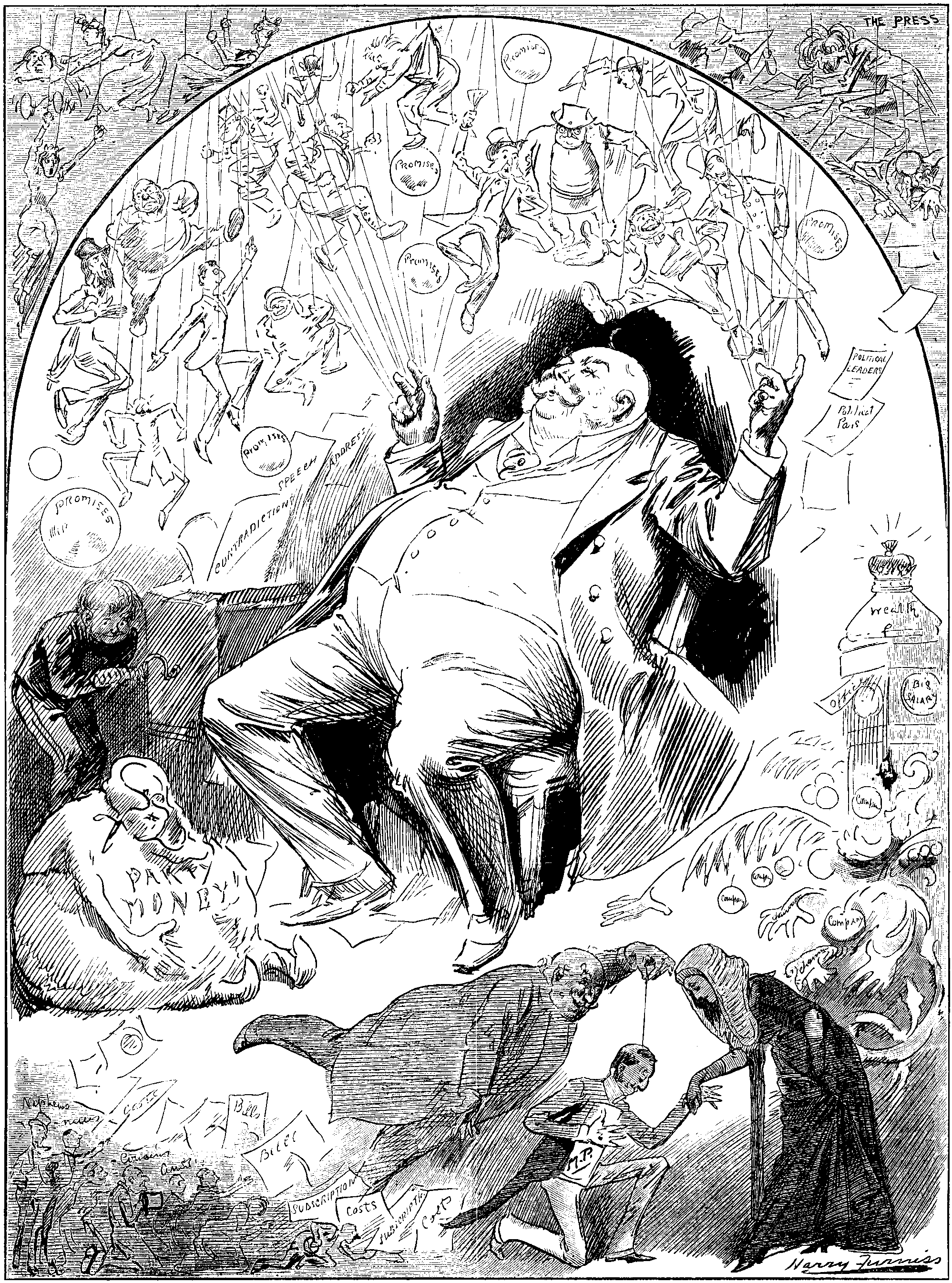 [Scene closes in upon the Minister receiving hearty congratulations from all sides of the Chamber.