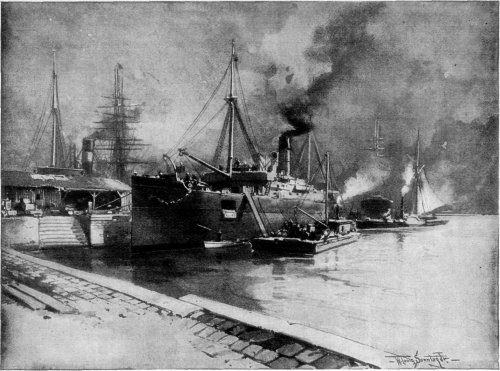 THE "DIMBULA" TAKING CARGO FOR HER FIRST VOYAGE.