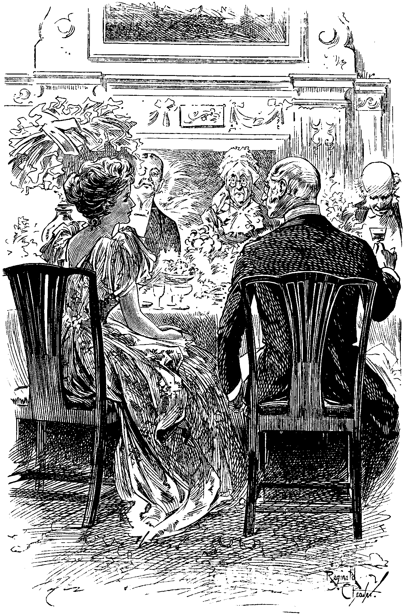 Mr. F. Smart people of the period, my dear. Of course Dido would send out invitations for a big function like that—Wind-up of the season—Farewell Reception—sure to be a tremendous rush for cards. Notice the evident enjoyment of the guests. They are depicted in the act of remarking to one another that their hostess is doing all in her power to make the thing go off well. Keen observer of human nature, old LIBERALE!