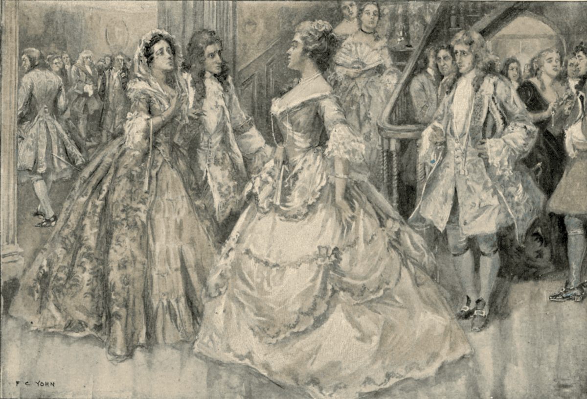 Alce, who had been a red-cheeked dairymaid in a great house in England, needed no admonition. Her curtsy was profound; and when the Governor took her by the hand and kissed her still blooming cheek, she curtsied again. Molly, who had no memories of fine gentlemen and the complaisance which was their due, blushed fire-red at the touch of his Excellency's lips, forgot to curtsy, and knew not where to look. When, in her confusion, she turned her head aside, her eyes met those of the young man who had threatened to turn Papist. He bowed, with his hand upon his heart, and she blushed more deeply than before.