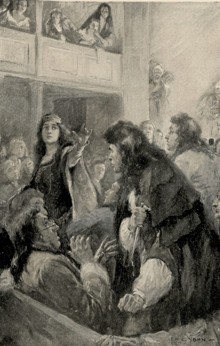 It was quite in nature and the mode for an actress to pause in the middle of a scene to curtsy thanks for generous applause, to smile and throw a mocking kiss to pit and boxes, but Darden's Audrey had hitherto not followed the fashion. Also it was not uncustomary for some spoiled favorite of a player to trip down, between her scenes, the step or two from the stage to the pit, and mingle with the gallants there, laugh, jest, accept languishing glances, audacious comparisons, and such weighty trifles as gilt snuffboxes and rings of price. But this player had not heretofore honored the custom; moreover, at present she was needed upon the stage. Bajazet must thunder and she defy; without her the play could not move, and indeed the actors were now staring with the audience. What was it? Why had she crossed the stage, and, slowly, smilingly, beautiful and stately in her gleaming robes, descended those few steps which led to the pit? What had she to do there, throwing smiling glances to right and left, lightly waving the folk, gentle and simple, from her path, pressing steadily onward to some unguessed-at goal. As though held by a spell they watched her, one and all,—Haward, Evelyn, the Governor, the man in the cloak, every soul in that motley assemblage. The wonder had not time to dull, for the moments were few between her final leave-taking of those boards which she had trodden supreme and the crashing and terrible chord which was to close the entertainment of this night.